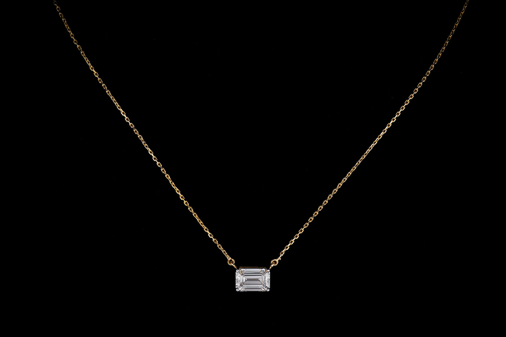 A 1.6-carat emerald cut solitaire pendant with a thin gold chain features a sleek, rectangular emerald-cut diamond, exuding sophistication with its step-cut facets. Suspended from a delicate, slender gold chain, the pendant allows the diamond's clarity and elegance to shine through, offering a timeless and refined accessory for any occasion.