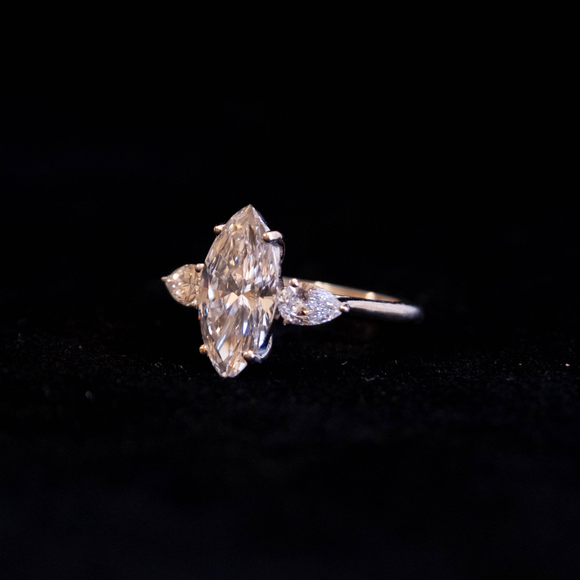 This 2.5 carat marquise solitaire ring features a striking center diamond flanked by two delicate pear-shaped side diamonds, all set in a sleek gold band. The elongated marquise adds elegance and brilliance, while the pear accents enhance its allure. A refined, graceful design perfect for timeless sophistication and modern romance.