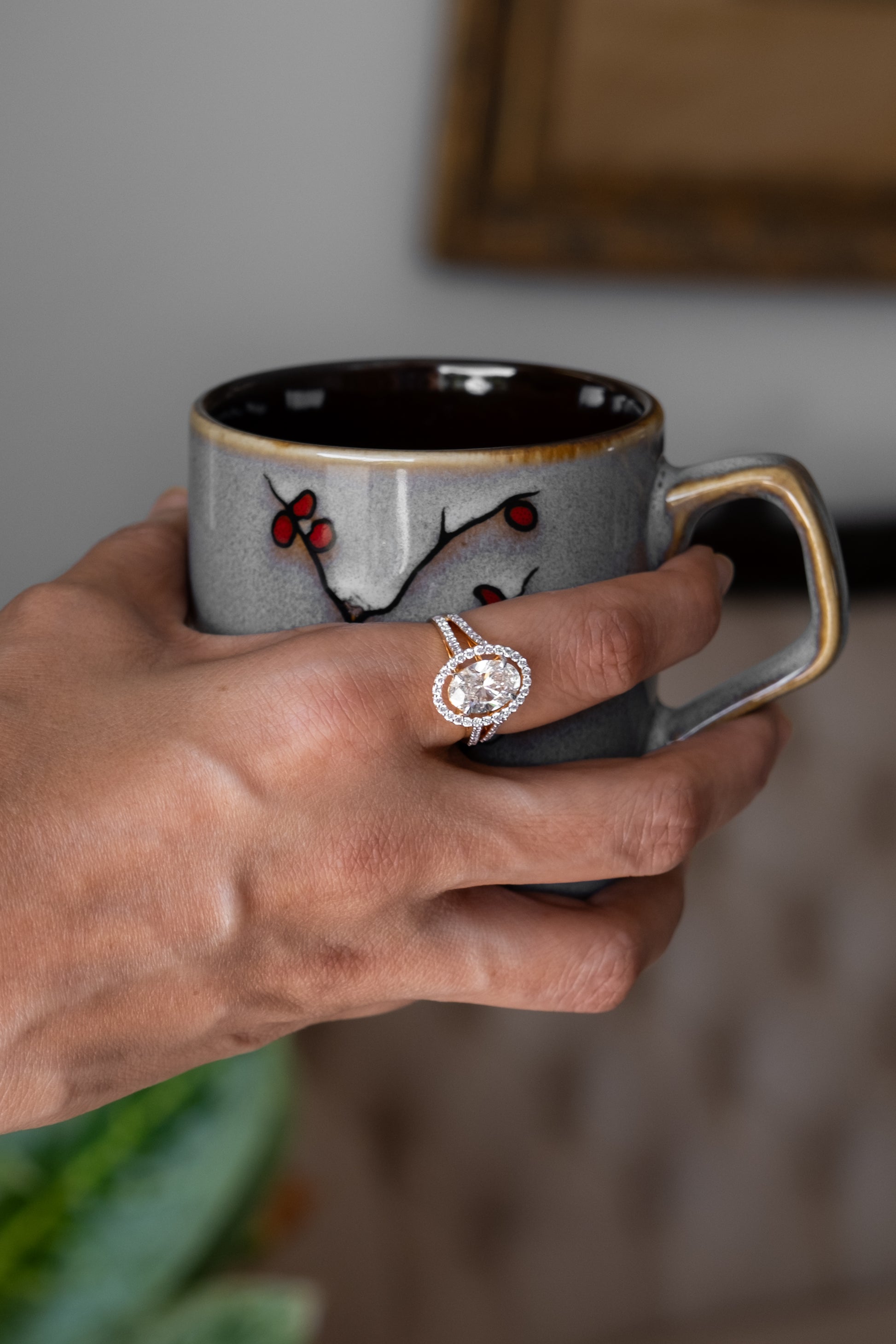 A 2-carat oval solitaire ring with a halo and split band in gold features a stunning oval diamond surrounded by a sparkling halo of smaller diamonds. The split band adds a modern, elegant touch, enhancing the ring’s overall brilliance. Crafted in warm gold, it exudes luxury, sophistication, and timeless beauty.