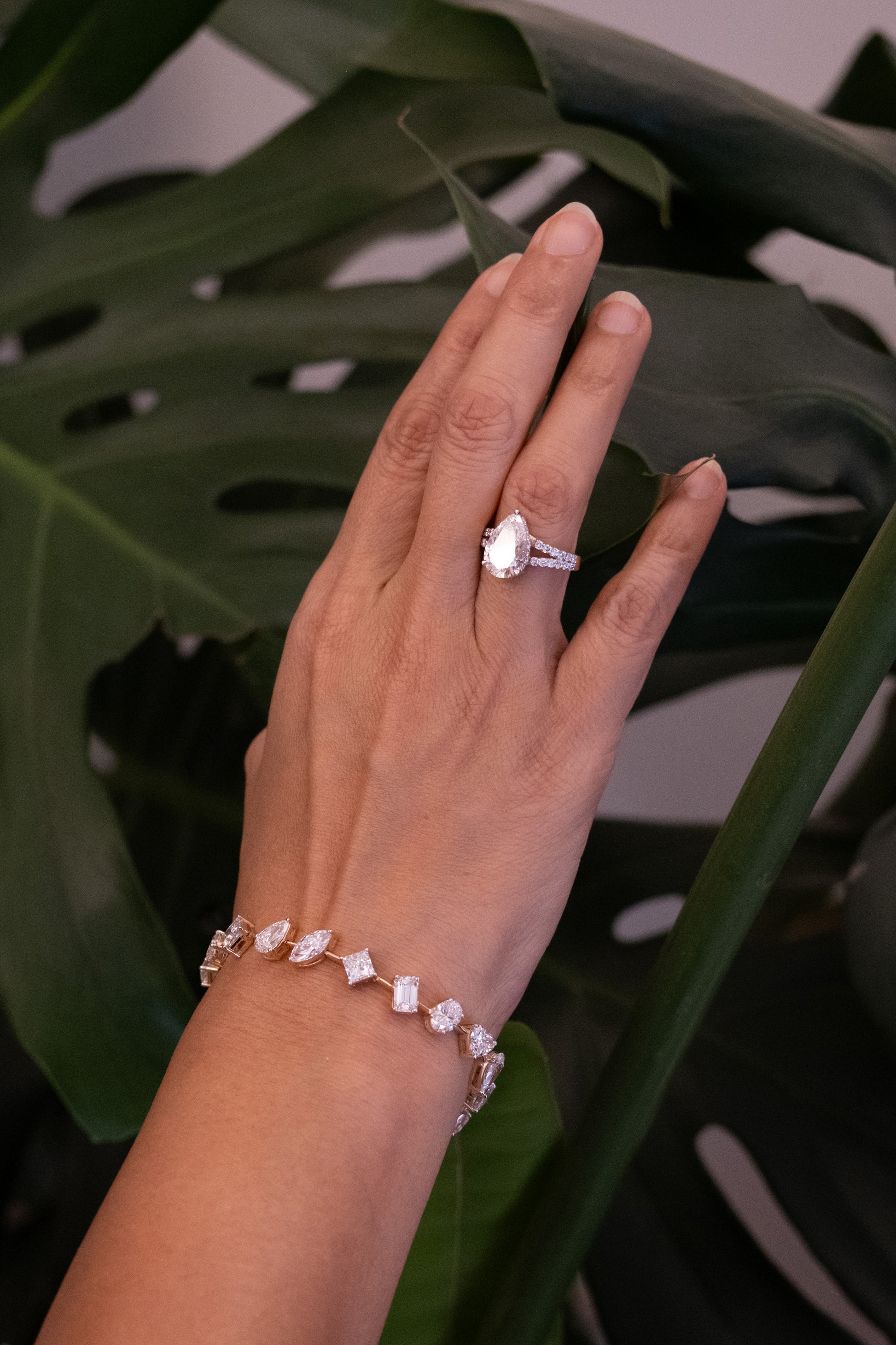 A 3-carat pear solitaire ring with a split diamond gold band features a stunning pear-shaped diamond as the focal point. The band splits gracefully, adorned with sparkling diamonds, enhancing the elegance and brilliance of the design. Crafted in gold, this ring exudes timeless beauty and sophisticated charm, perfect for any occasion.