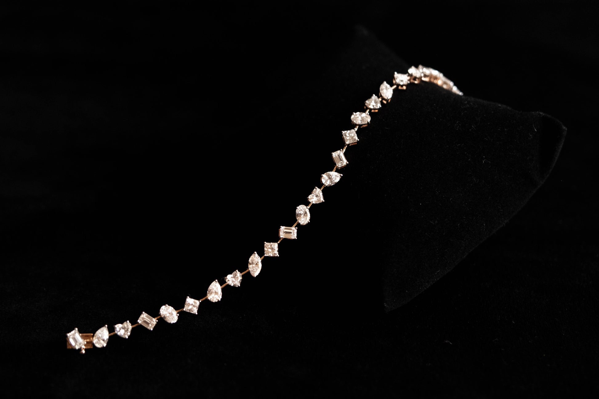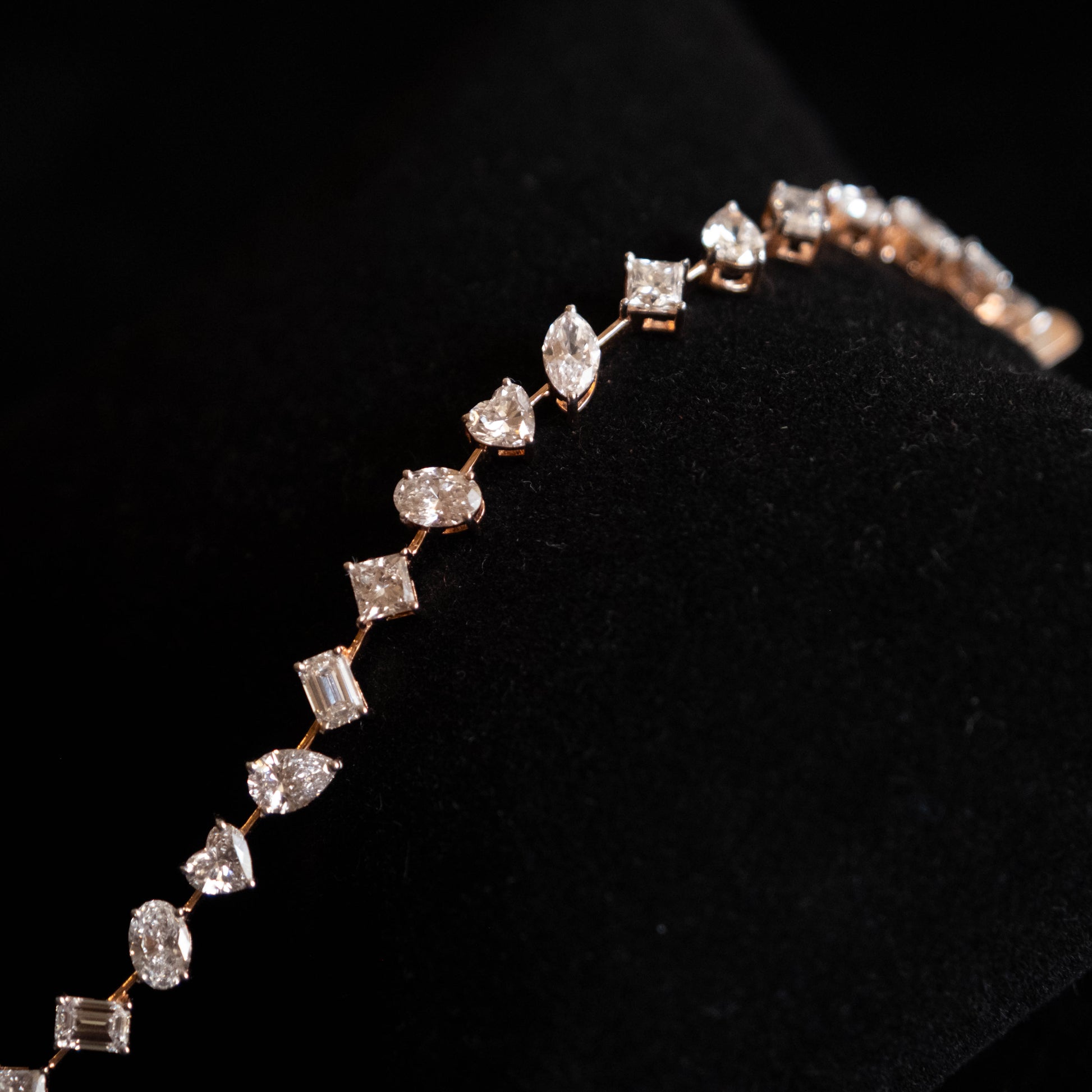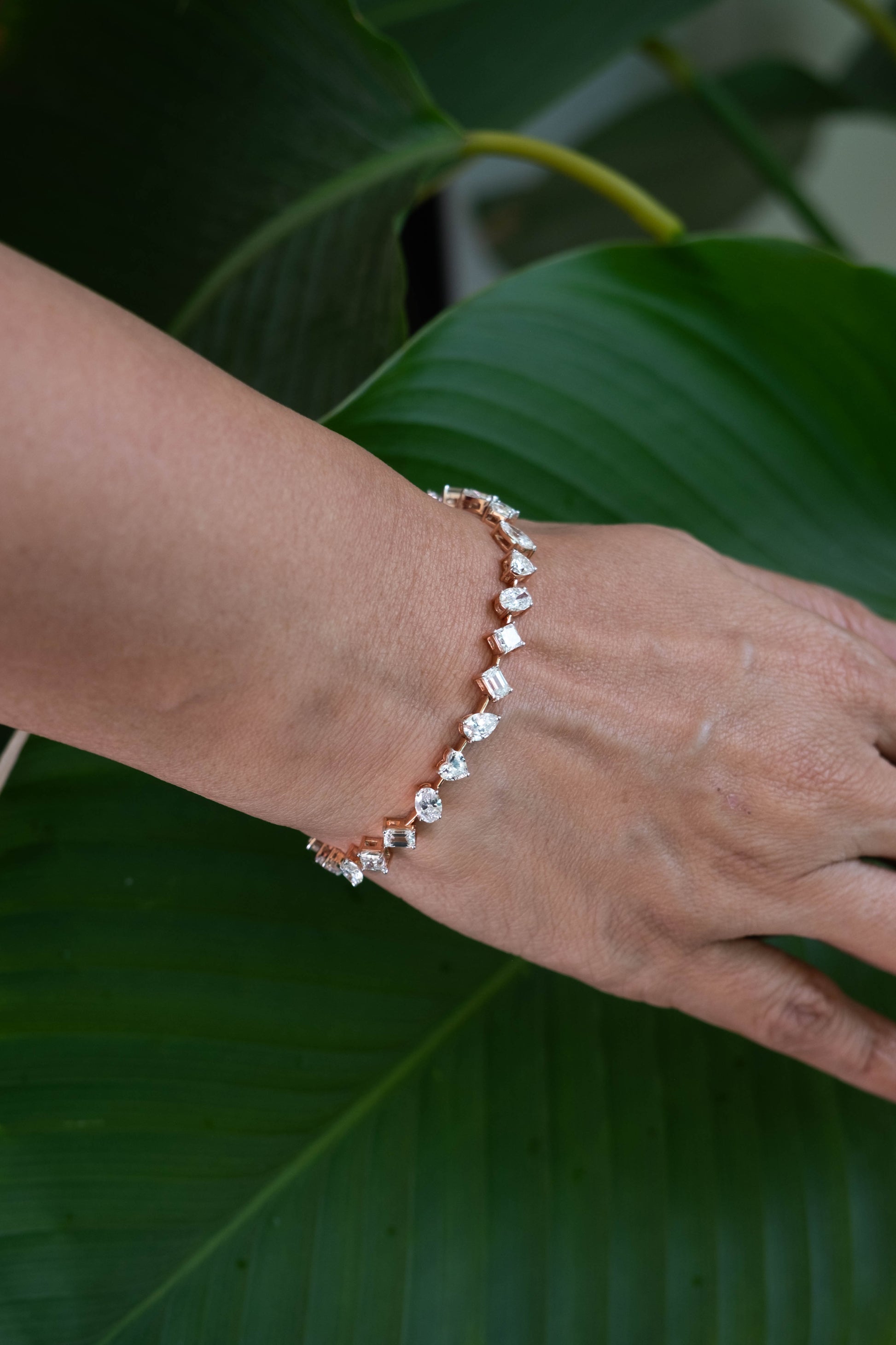 This tennis bracelet features a captivating mix of diamond shapes— heart, pear, marquise, emerald cuts and so on—each weighing 30 cents. The varied silhouettes create a rhythmic, eye-catching design, blending classic elegance with modern artistry. Sparkling with brilliance and character, it's a luxurious statement piece that adds depth and sophistication to any look.