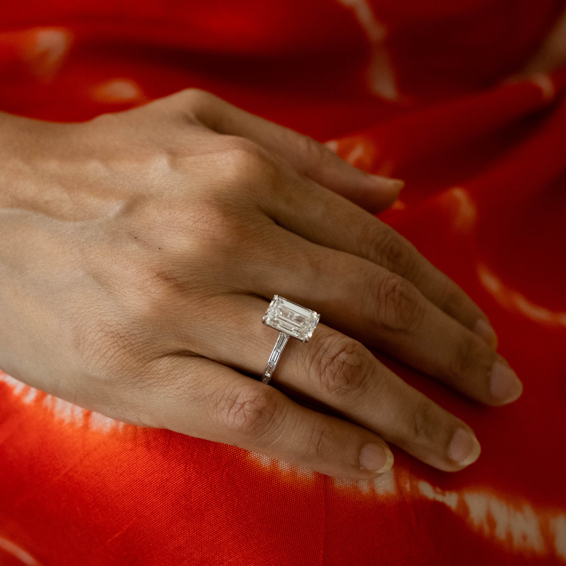 This 4 carat emerald-cut solitaire ring exudes refined elegance, featuring a striking center stone flanked by thin horizontal baguettes set into the band. The clean lines and geometric symmetry enhance the emerald cut’s brilliance, while the baguettes add subtle sparkle—creating a sophisticated, modern masterpiece with timeless appeal.