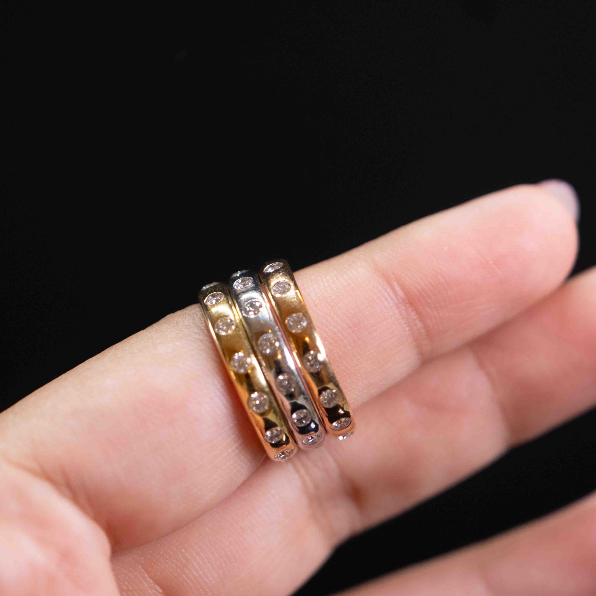 A flush setting diamond ring features a sleek design where the diamonds are set snugly within the band, creating a smooth surface. This style showcases the gems securely, without prongs, ensuring a modern, minimalist look. Perfect for everyday wear, it combines elegance and practicality, making it a timeless choice.