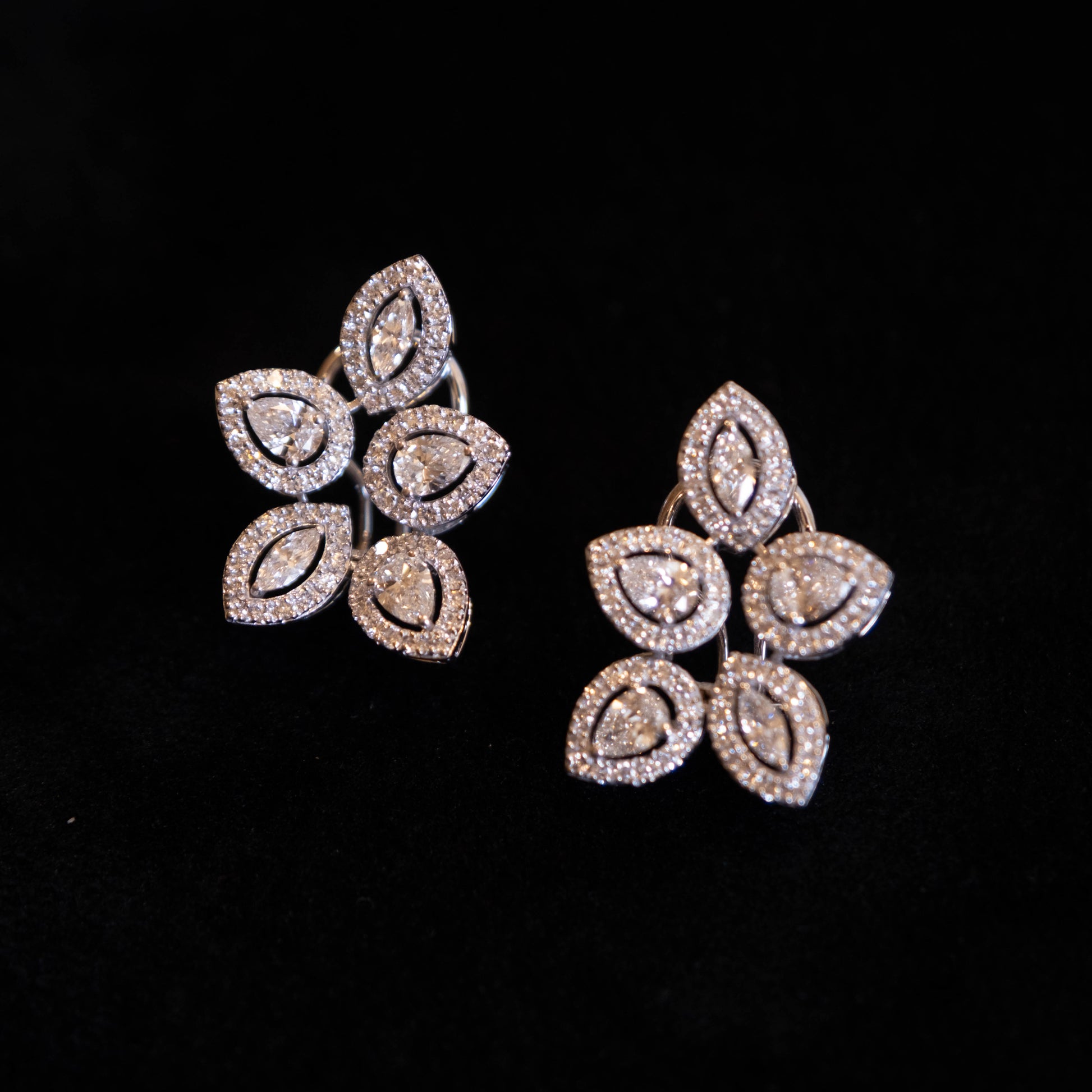 These cluster earrings feature an exquisite arrangement of pear and marquise diamonds, artfully set to create a floral-inspired silhouette. Encircled by a delicate halo of smaller round diamonds, the design radiates brilliance and elegance. Perfect for special occasions, they offer a luxurious blend of sparkle, grace, and timeless charm.